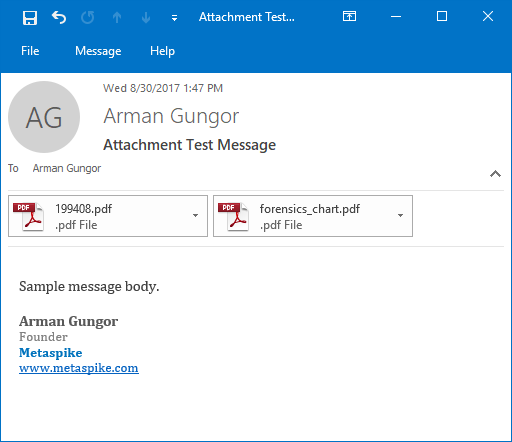 I started by preparing a test message with two PDF attachments. The resulting MSG file was 888,320 bytes in size, mostly because of the two PDF attachments, which were 810,654 bytes in total. The message looked as follows: